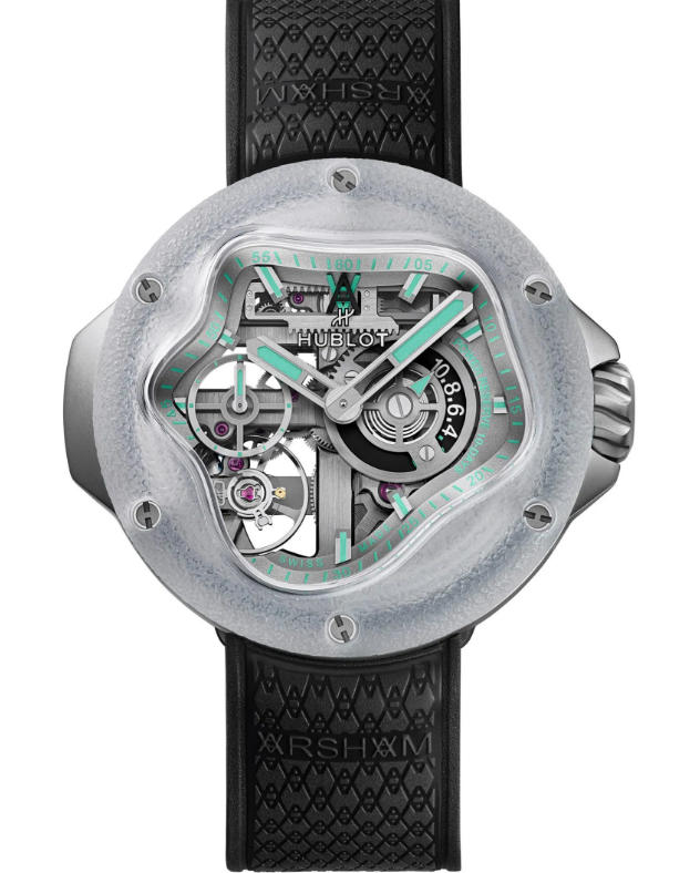 Daniel concurs. “This collaboration with Hublot explores the fluidity of time through a case inspired by the perfect geometry of a water droplet, crafted using Hublot’s Meca-10 movement. The watch’s transparent structure captures the clarity and motion of water, suspended, precise, and always in flux. It has been an ongoing collaboration for almost four years now, and as with every project that I do with a larger company, I like to use their material science and possibilities present within their company to create something new that hasn’t existed before in their work or in my own…”