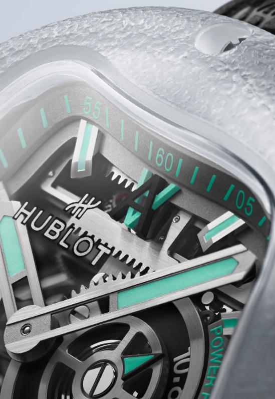 The choice of sapphire crystal – used for the frosted box-shaped bezel – along with titanium and rubber as the raw materials, underpins the essence of Art of Fusion and has provided the perfect base to sculpt the cheap fake watches organic shape that’s inspired by flowing water. The defining feature is a striking splash-shaped opening on the dial, which is a direct evolution from the MP-16’s droplet inspiration.
